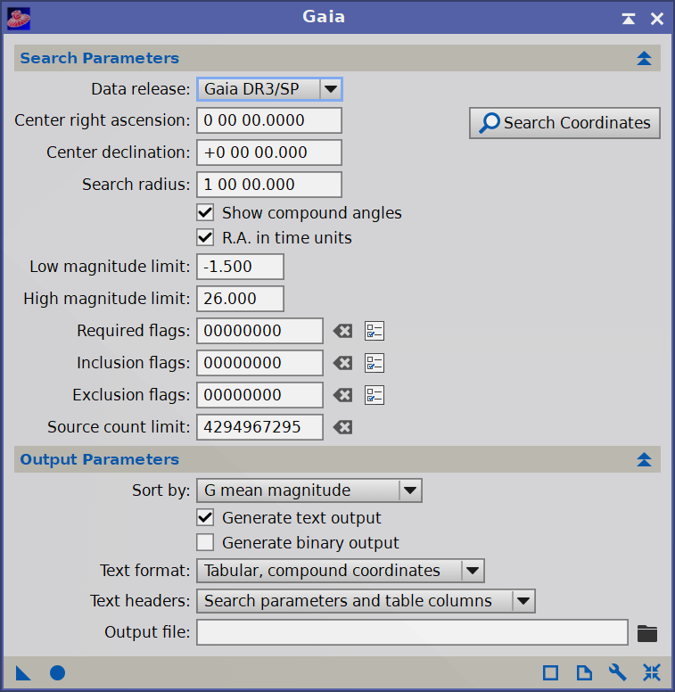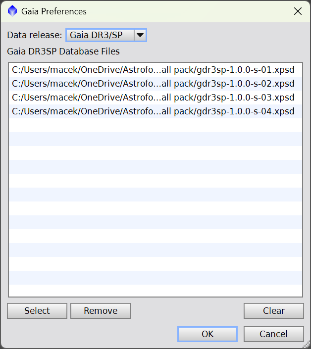 Potvrďte tlačítkem OK a zkontrolujte, že „Data release“ je nastavené na Gaia DR3/SP.
