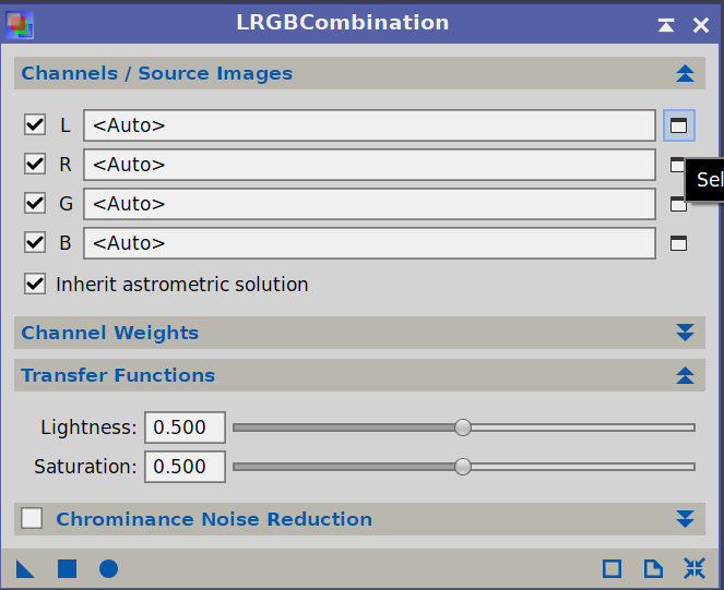 Přiřaďte kanály – V rozbalovacích seznamech L, R, G, B vyberte odpovídající otevřené snímky, u každého řádku kanálu použijte tlačítko okna vpravo. V okně LRGBCombination: