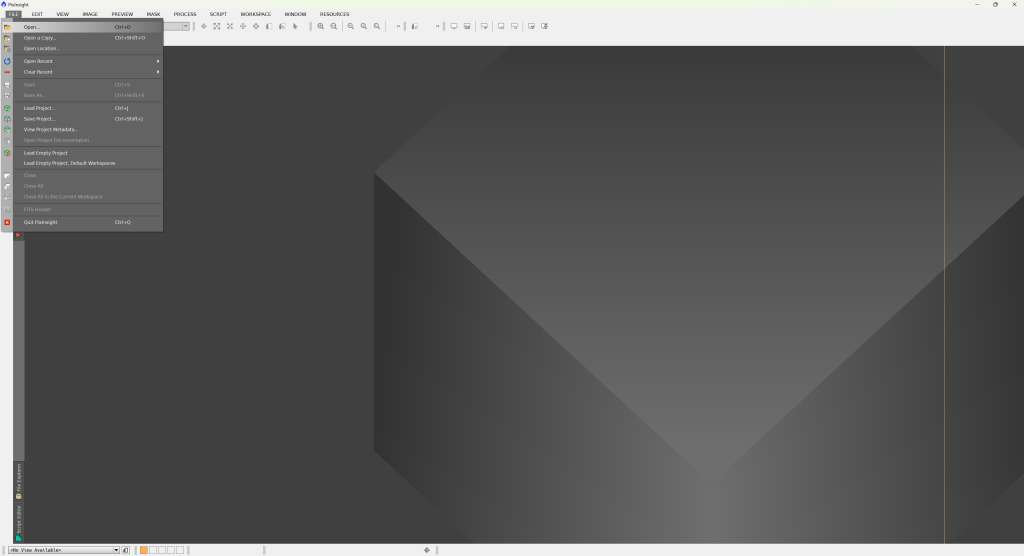 Na první pohled nic moc, že? Nevadí – pustíme se do toho. Okno si přizpůsobte velikostí monitoru a obrázek přibližte kolečkem myši, aby byl co největší. V horní liště klikněte na ikonku monitoru se symbolem „radioaktivity“. Pokud ji nevidíte, otevřete Process → ScreenTransferFunction. Po kliknutí se okamžitě změní zobrazení.
