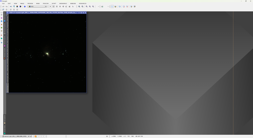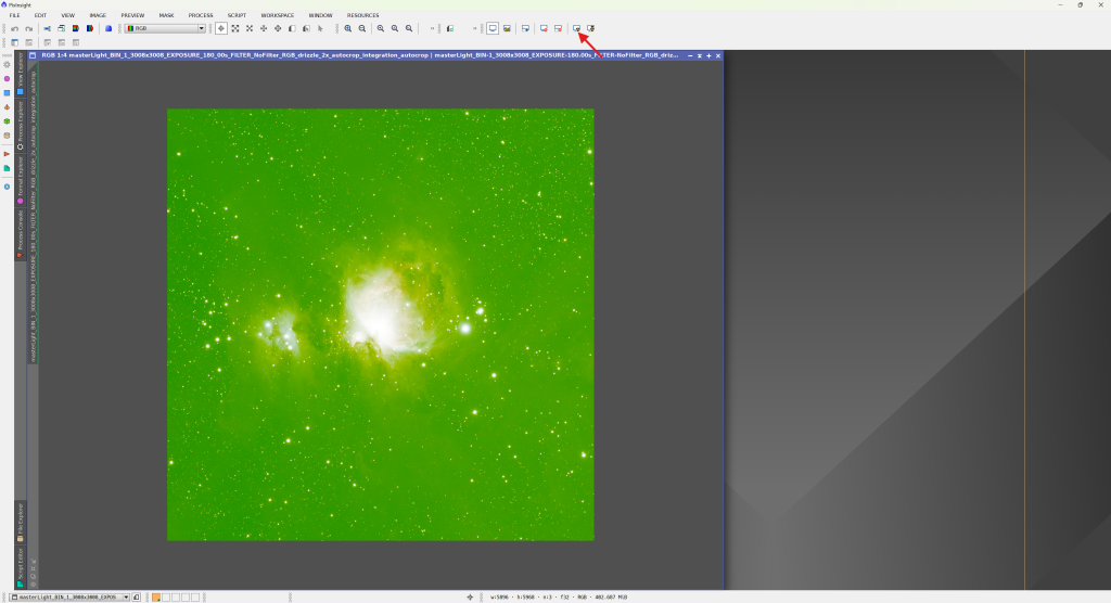 PixInsight teď pouze pro zobrazení upravil histogram – data se nijak nezměnila. Funkce se jmenuje STF AutoStretch. Obrázek je znatelně zelený, protože barevné kamery zaznamenávají zhruba 2× více zelené než ostatních barev. Není to problém – stačí znovu kliknout s drženým Ctrl a AutoStretch vyrovná barevné kanály. K původnímu vzhledu se vrátíte podržením Shift a kliknutím.
