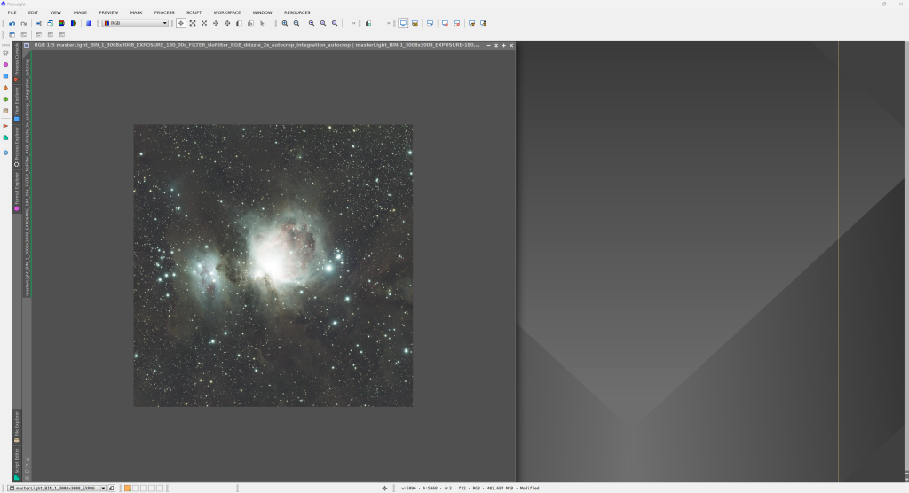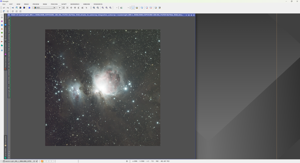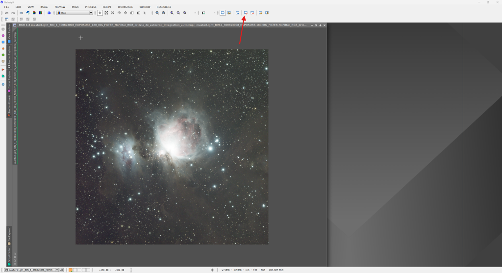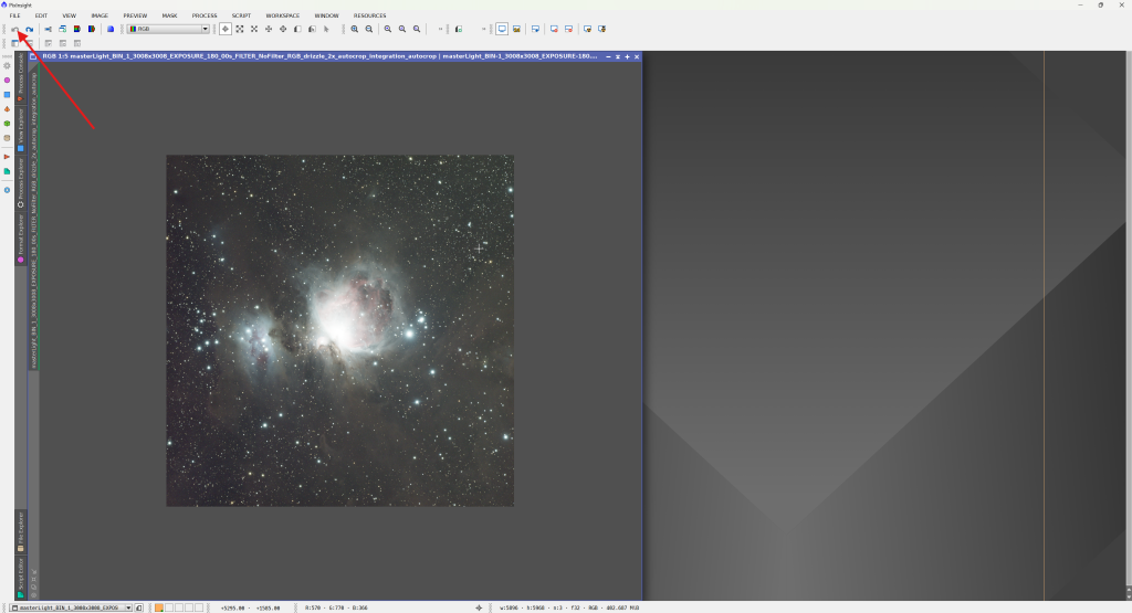 Teď konečně otevřeme složený snímek z minulého dílu. Klikněte na File → Open, najděte adresář s výsledky WBPP a otevřete soubor masterLight…_integration_drizzle_autocrop.xisf, jak jsme si řekli na konci předchozího dílu.