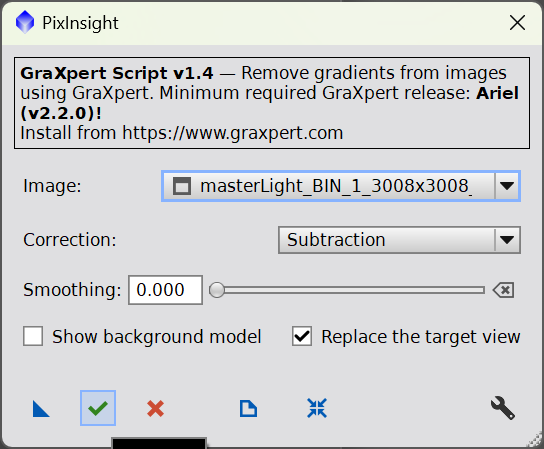 Pokud jste instalovali doplňky podle prvního dílu”PixInsight pro úplné začátečníky #1 – Instalace PixInsight, příprava prostředí”), otevřete Scripts → Toolbox → GraXpert.