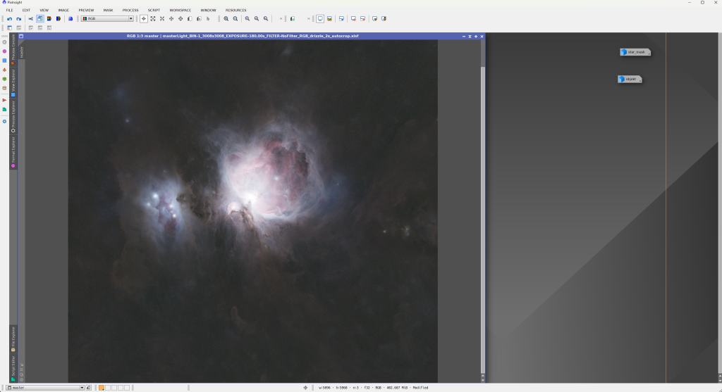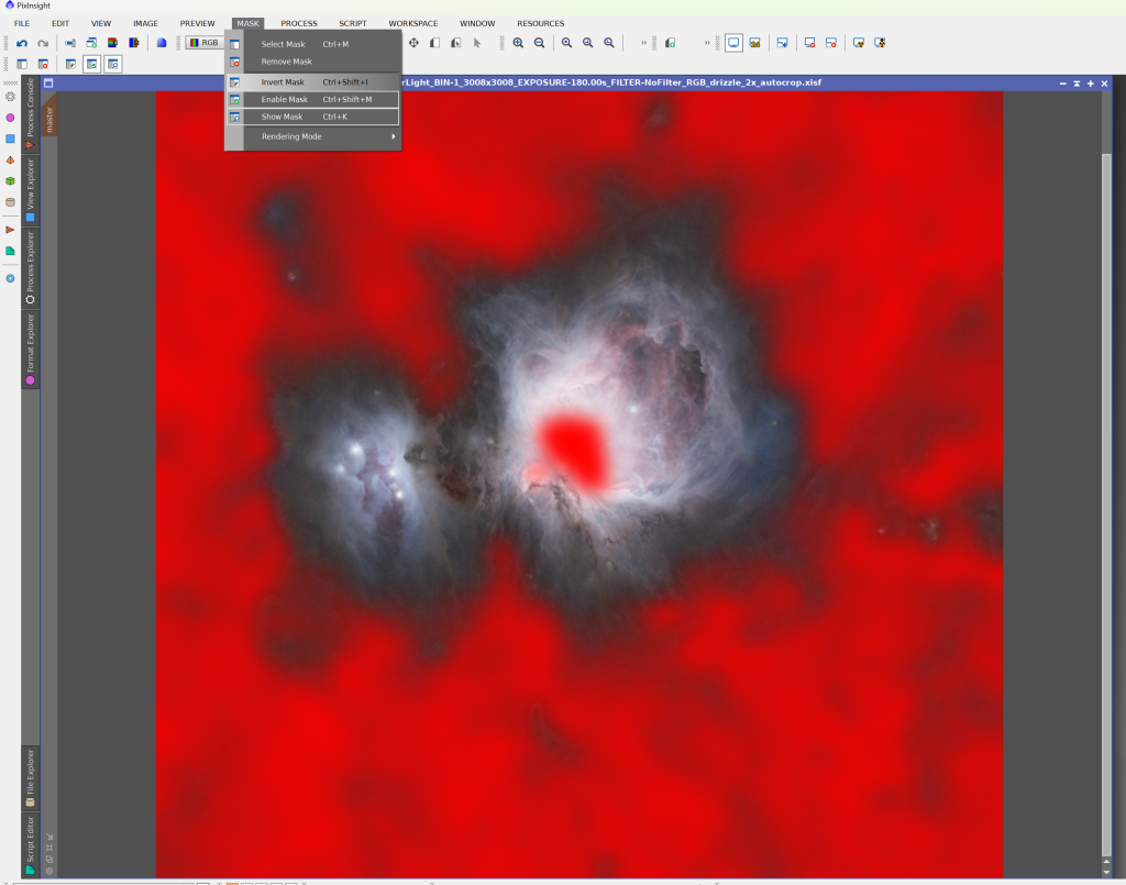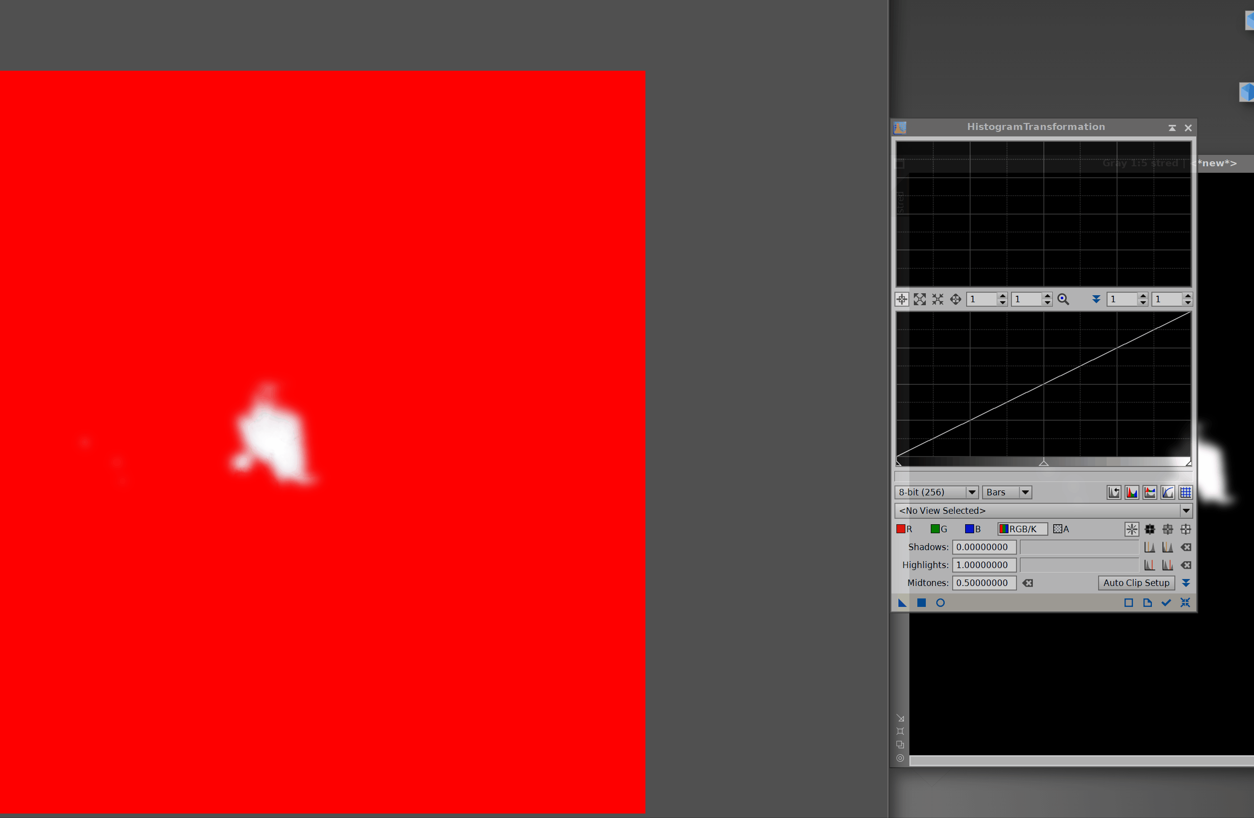 Bohužel v tomto případě jedna maska nebude stačit. Zavřete Preview, zavřete HistogramTransformation, zrušte a smažte masku pro střed.